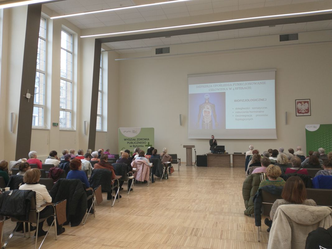 dr n. o zdr. Michał Górski, psychogeriatra z Katedry Chorób Przewlekłych i Zagrożeń Cywilizacyjnych Wydziału Zdrowia Publicznego w Bytomiu przedstawił uczestnikom spotkania, czym jest depresja, jakie objawy powinny zwrócić uwagę seniorów oraz jak pomóc sobie lub bliskim, u których podejrzewamy występowanie depresji. Na zakończenie spotkania uczestnicy mieli okazję zadawać pytania prelegentowi i uzyskać odpowiedzi na nurtujące ich zagadnienia.